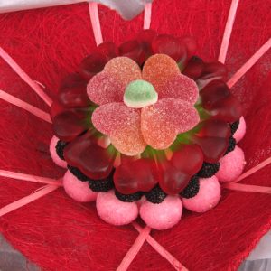 Ce bouquet dans sa corbeille en forme de coeur est composé de fraises tagada pink, de mures, de cerises et de coeurs de pêche. Vous le partagerez avec 6 convives.